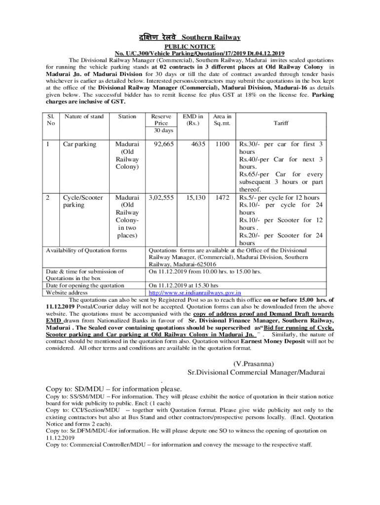 Southern Railway PUBLIC NOTICE No. U/C.300/Vehicle Parking/Quotation/17/2019 DT.04.12.2019 The Divisional Railway Manager (Commercial), Southern Railway, Madurai invites sealed quotations for running