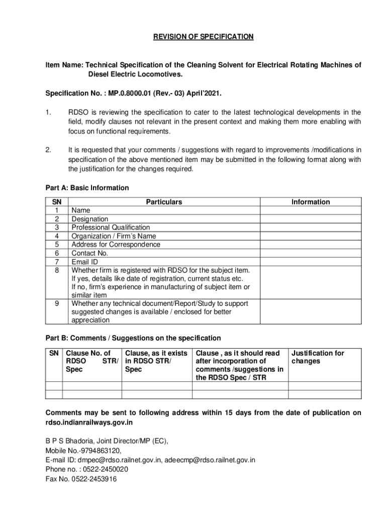 REVISION OF SPECIFICATIONItem Name: Technical Specification of the Cleaning Solvent for Electrical Rotating Machines of Diesel Electric Locomotives. Specification No. MP.0.8000.01 (Rev. 03) April2021.