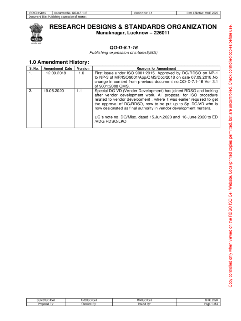 Version No: 1.1Date Effective: 19.06.2020RESEARCH DESIGNS & STANDARDS ORGANIZATION Manaknagar, Lucknow 226011 QOD8.116 Publishing expression of interest(EOI)1.0 Amendment History: S. No. 1. Amendment