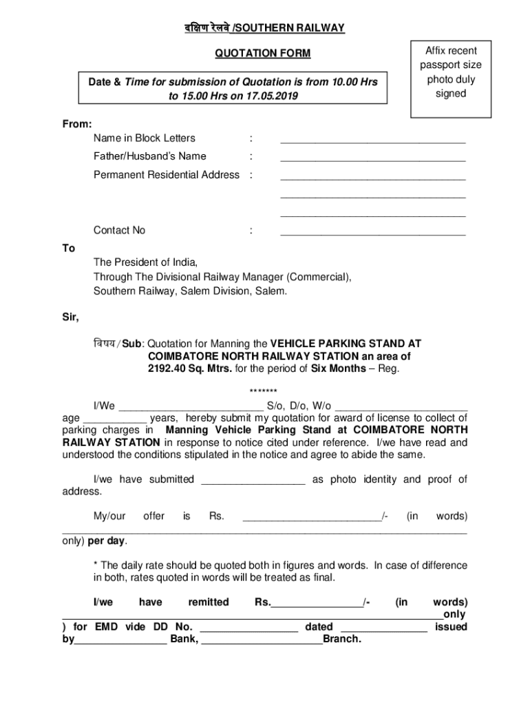 /SOUTHERN RAILWAY QUOTATION FORM Date & Time for submission of Quotation is from 10.00 Hrs to 15.00 Hrs on 17.05.2019Affix recent passport size photo duly signedFrom: Name in Block Letters:___Father/Husbands
