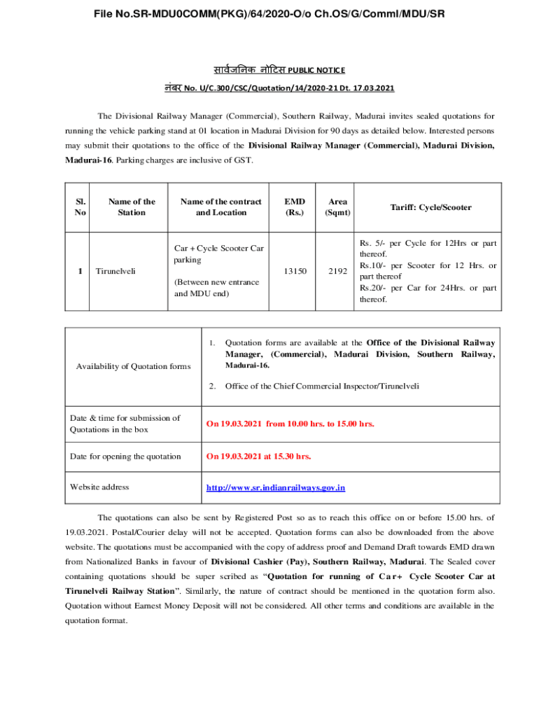 File No.SRMDU0COMM(PKG)/64/2020O/o Ch.OS/G/Comml/MDU/SR PUBLIC NOTICE No. U/C.300/CSC/Quotation/14/202021 DT. 17.03.2021 The Divisional Railway Manager (Commercial), Southern Railway, Madurai invites