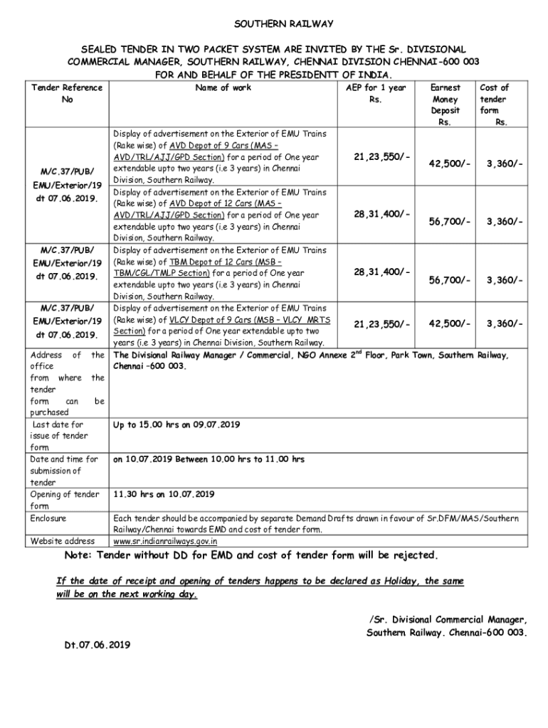 SOUTHERN RAILWAY SEALED TENDER IN TWO PACKET SYSTEM ARE INVITED BY THE Sr. DIVISIONAL COMMERCIAL MANAGER, SOUTHERN RAILWAY, CHENNAI DIVISION CHENNAI600 003 FOR AND BEHALF OF THE PRESIDENT OF INDIA.