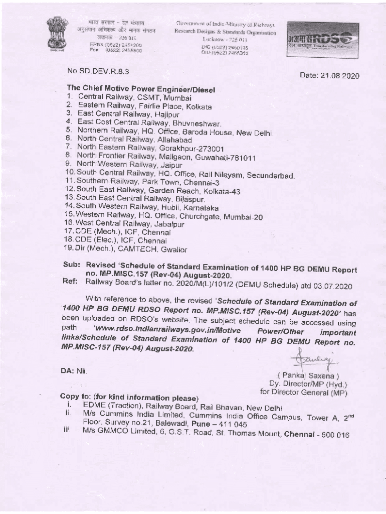 * 1r. I1(\” itvrrrirrrtu oi lnrliuMiqistrv NF Rail×y* let rail BBX $52? ?4S.TFS IS?? ?$4dFsxl,Lucknow, ?:fill Did $0s?) ?45S 1 I $ NTP $022) $245310No.SD.DEV. R.8.3Date: 21.0g.2020The Chief Motive