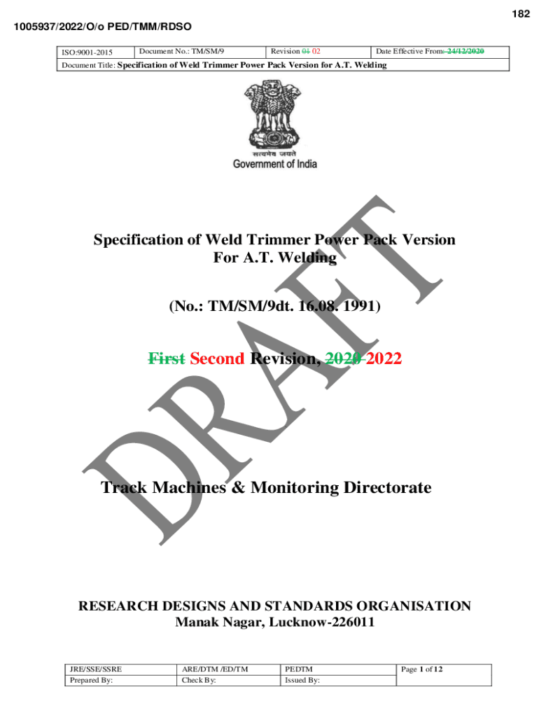 182 1005937/2022/O/o PED/MM/DSO ISO:90012015Document No.: TM/SM/9Revision 01 02Date Effective From: 24/12/2020Document Title: Specification of Weld Trimmer Power Pack Version for A.T. WeldingSpecification