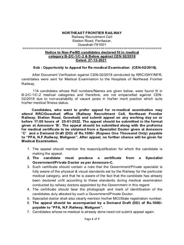 NORTHEAST FRONTIER RAILWAY Recruitment Cell Station Road, Panama, Guwahati781001 Notice to Nonfood candidates declared fit in medical category B2/C1/C2 & Below against CEN 02/2018 Dated: 27122021