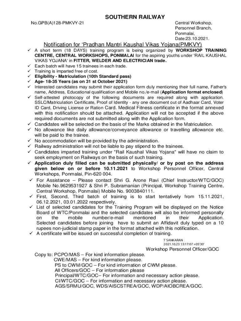 SOUTHERN RAILWAY No.GB(A)128PMKVY21Central Workshop, Personnel Branch, Somali, Date:23.10.2021. Notification for Pradhan Mantra Kushal Vikas Jana(PRIVY) A short term (18 DAYS) training program is