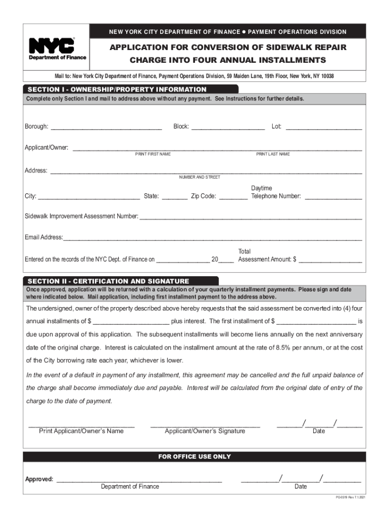 NEW YORK CITY DEPARTMENT OF FINANCElPAYMENT OPERATIONS DIVISIONALIZATION FOR CONVERSION OF SIDEWALK REPAIR CHARGE INTO FOUR ANNUAL INSTALLMENTS Mail to: New York City Department of Finance, Payment
