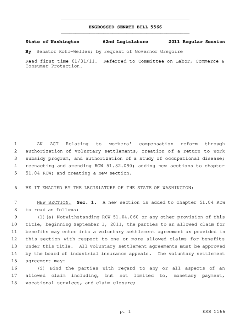 ___ ENGROSSED SENATE BILL 5566 ___ State of Washington By62nd Legislature2011 Regular SessionSenator Kohl Welles; by request of Governor GregoireRead first time 01/31/11. Consumer Protection. Referred