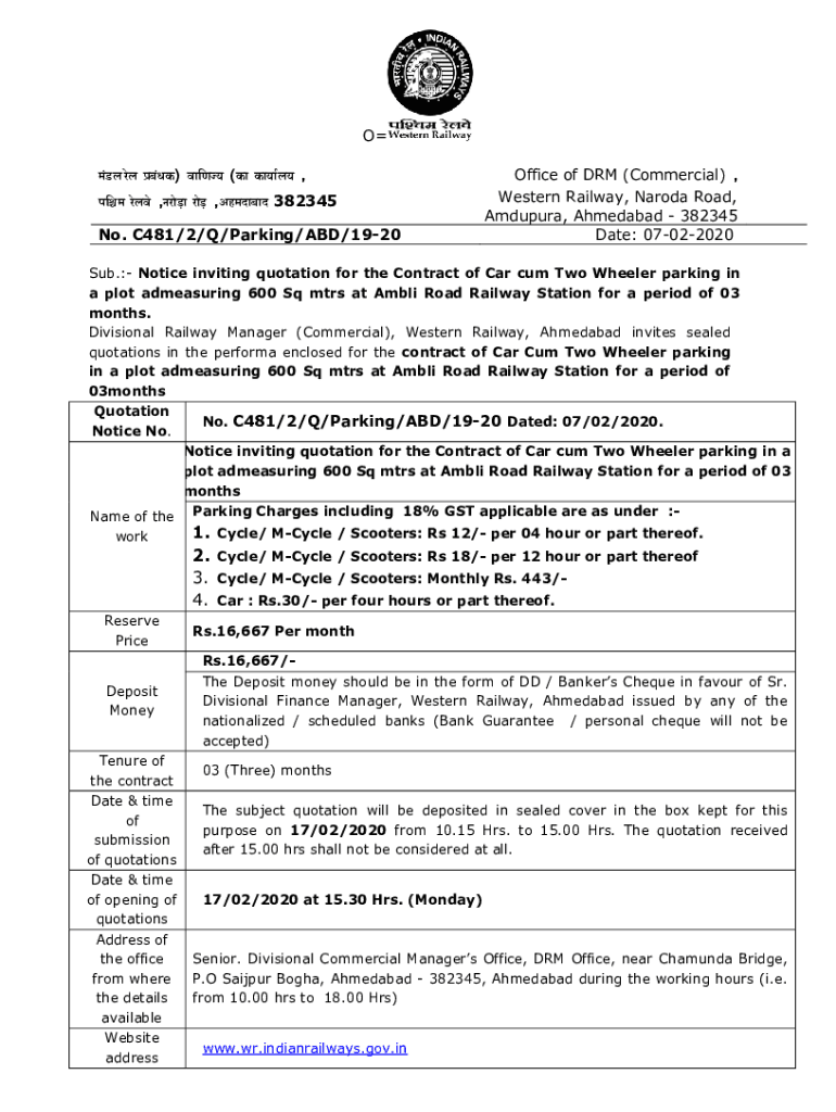 O) (,,, 382345 No. C481/2/Q/Parking/ABD/1920Office of DRM (Commercial), Western Railway, Baroda Road, Amdupura, Ahmedabad 382345 Date: 07022020Sub.: Notice inviting quotation for the Contract of Car