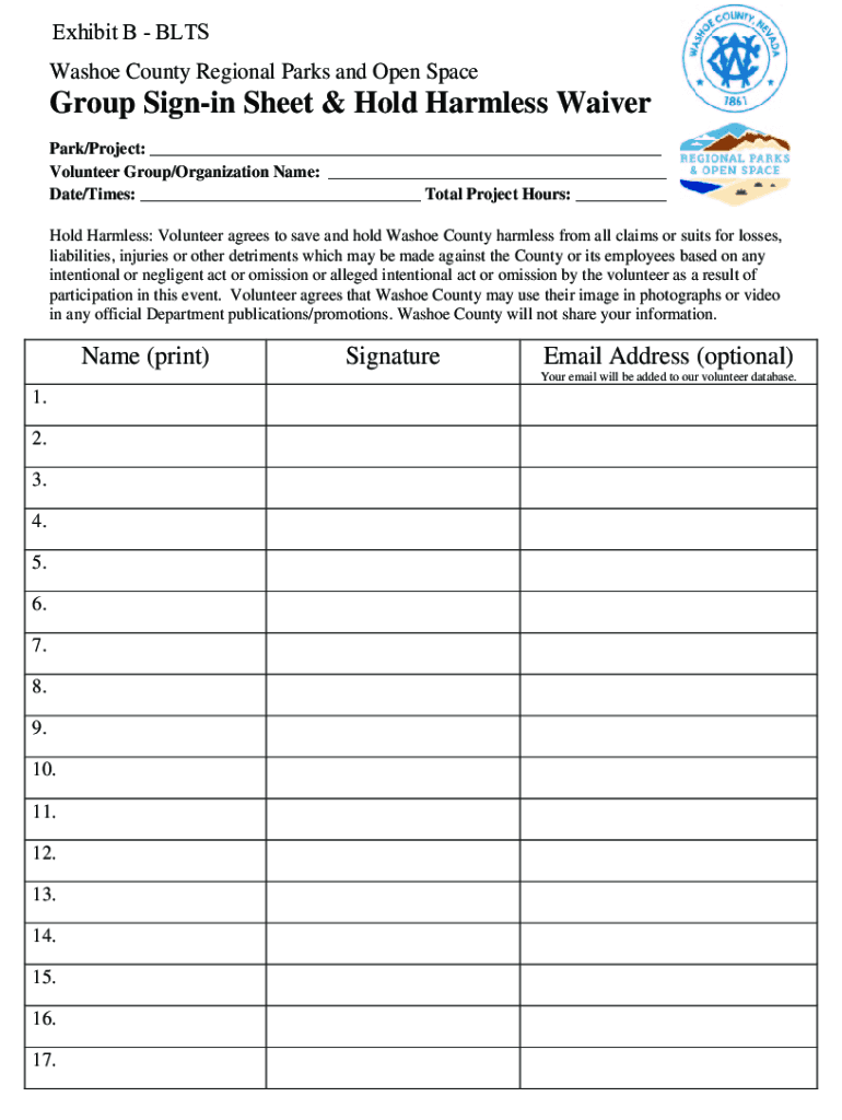 Exhibit B BLTs Washoe County Regional Parks and Open SpaceGroup Signing Sheet & Hold Harmless Waiver Park/Project: ___ Volunteer Group/Organization Name: ___ Date/Times: ___ Total Project Hours: ___