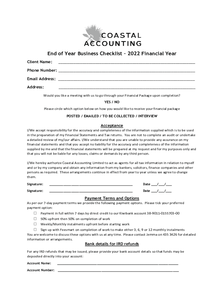 End of Year Business Checklist 2022 Financial Year Client Name:___Phone Number: ___ Email Address: ___ Address:___Would you like a meeting with us to go through your Financial Package upon completion?