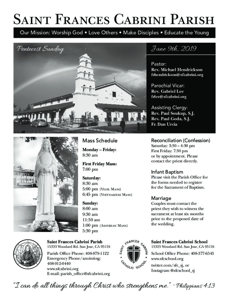 Saint Frances Cabrini Parish Our Mission: Worship God Love Others Make Disciples Educate the Young June 9th, 2019Pentecost SundayPastor:Rev. Michael Hendricksonfrhendrickson@sfcabrini.orgParochial