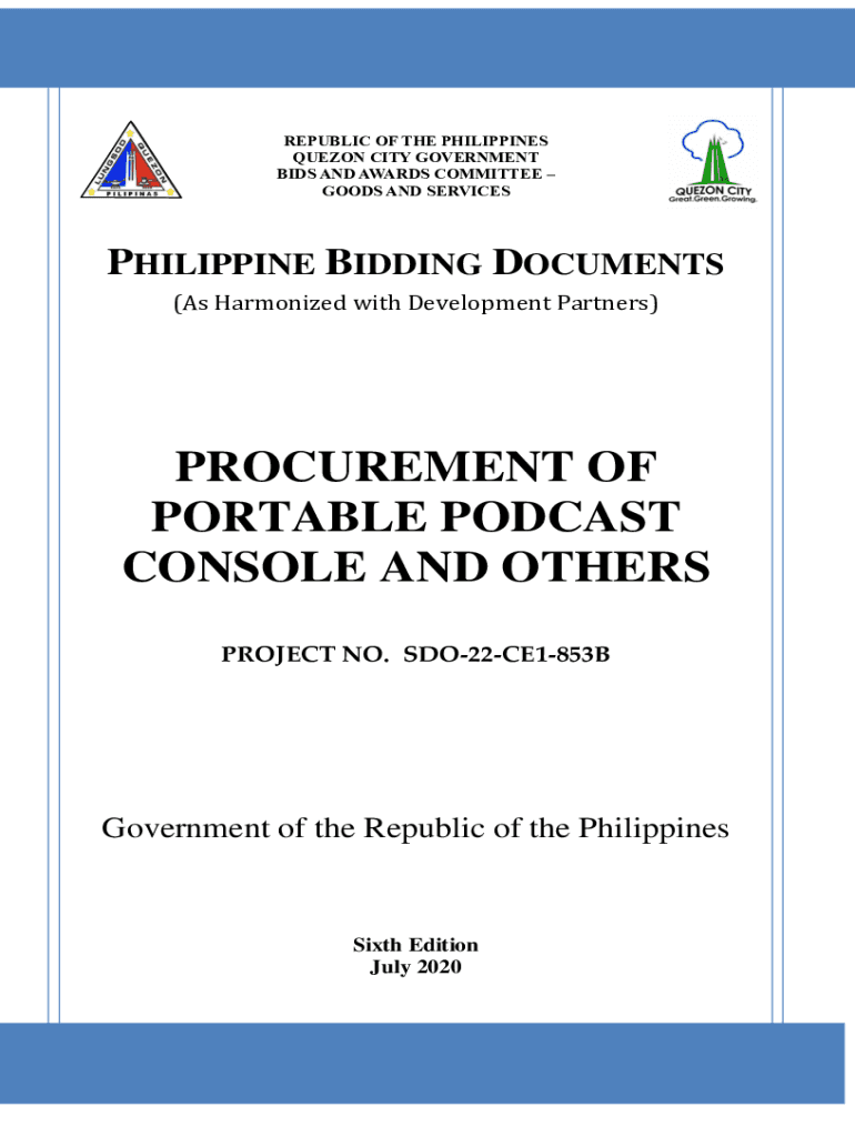REPUBLIC OF THE PHILIPPINES QUEZON CITY GOVERNMENT BIDS AND AWARDS COMMITTEE GOODS AND SERVICESPHILIPPINE BIDDING DOCUMENTS (As Harmonized with Development Partners)PROCUREMENT OF PORTABLE PODCAST