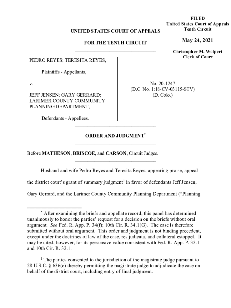 UNITED STATES COURT OF APPEALS FOR THE TENTH CIRCUIT ___ PEDRO REYES; TERESINA REYES, FILED United States Court of Appeals Tenth Circuit May 24, 2021, Christopher M. Colbert Clerk of CourtPlaintiffs