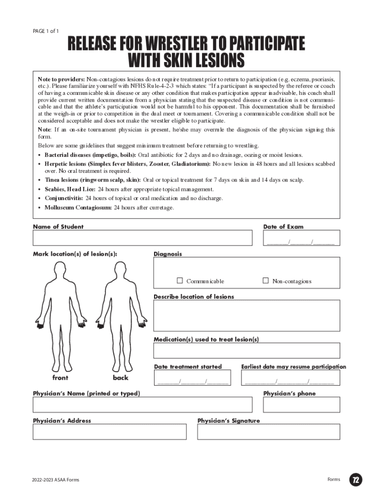 PAGE 1 of 1RELEASE FOR WRESTLER TO PARTICIPATE WITH SKIN LESIONSNote to providers: Noncontagious lesions do not require treatment prior to return to participation (e.g. eczema, psoriasis, etc.). Please