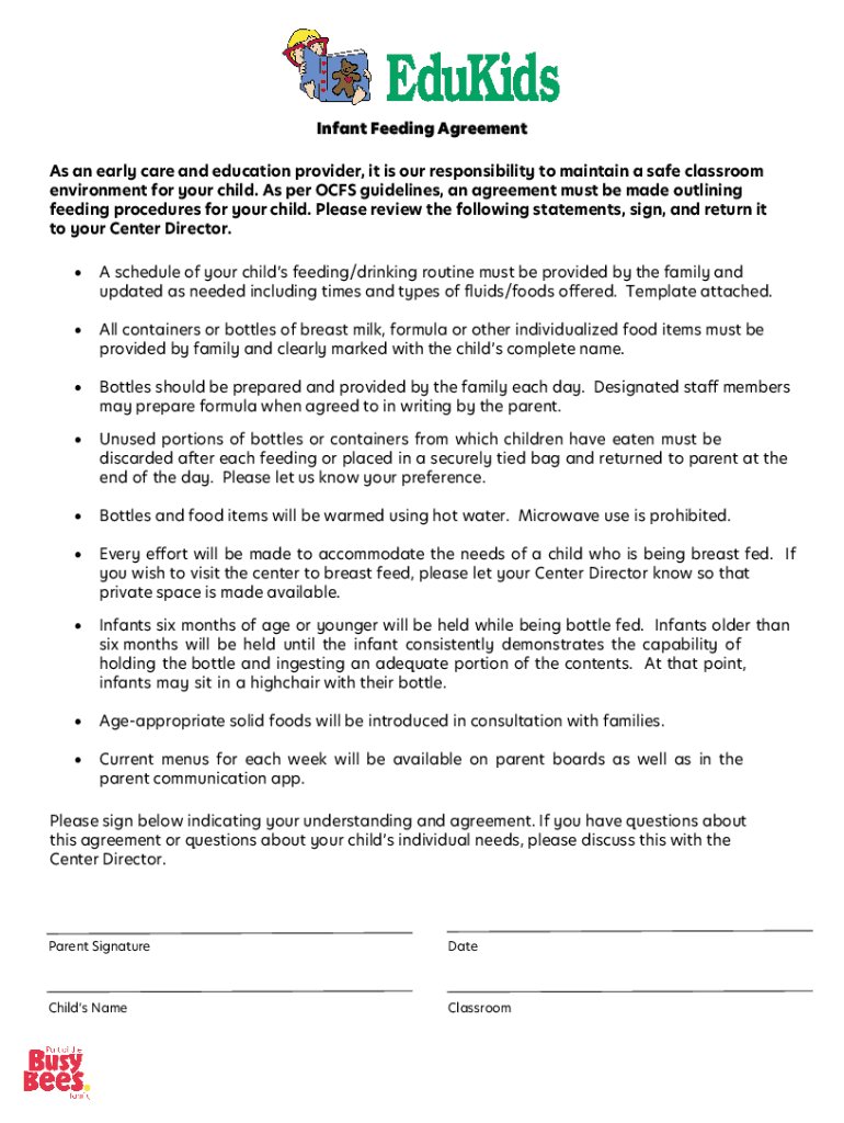 Infant Feeding Agreement As an early care and education provider, it is our responsibility to maintain a safe classroom environment for your child. As per OFFS guidelines, an agreement must be made