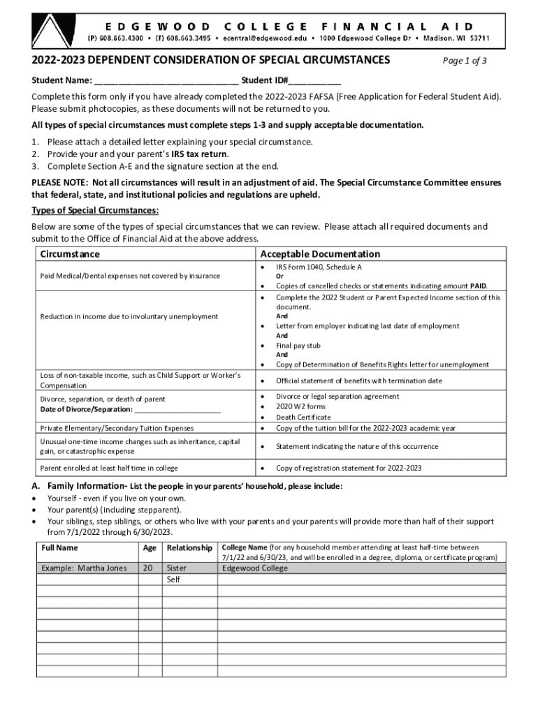 20222023 DEPENDENT CONSIDERATION OF SPECIAL CIRCUMSTANCES Page 1 of 3Student Name: ___ Student ID#___ Complete this form only if you have already completed the 20222023 FAFSA (Free Application for