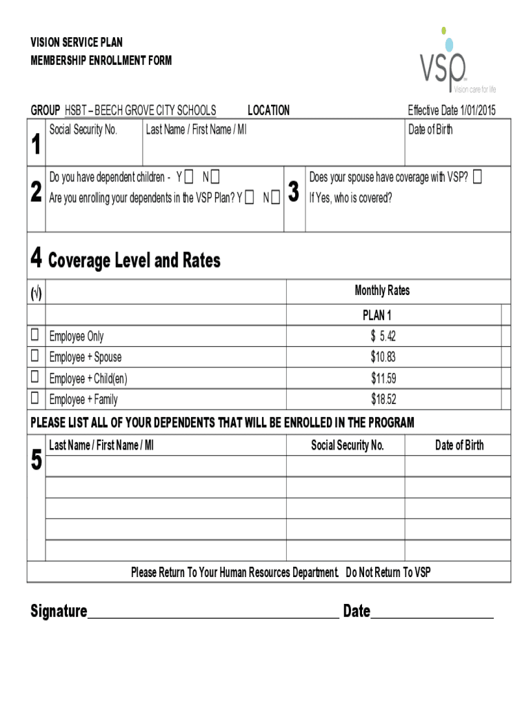 VISION SERVICE PLAN MEMBERSHIP ENROLLMENT WORKGROUP HSBC BEECH GROVE CITY SCHOOLS LOCATION Social Security No. Last Name / First Name / Effective Date 1/01/2015 Date of Birth1 2Do you have dependent