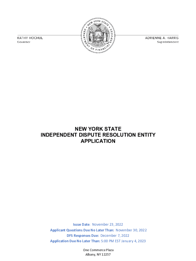 NEW YORK STATE INDEPENDENT DISPUTE RESOLUTION ENTITY APPLICATIONIssue Date: November 23, 2023, Applicant Questions Due No Later Than: November 30, 2023, DFS Responses Due: December 7, 2022, Application