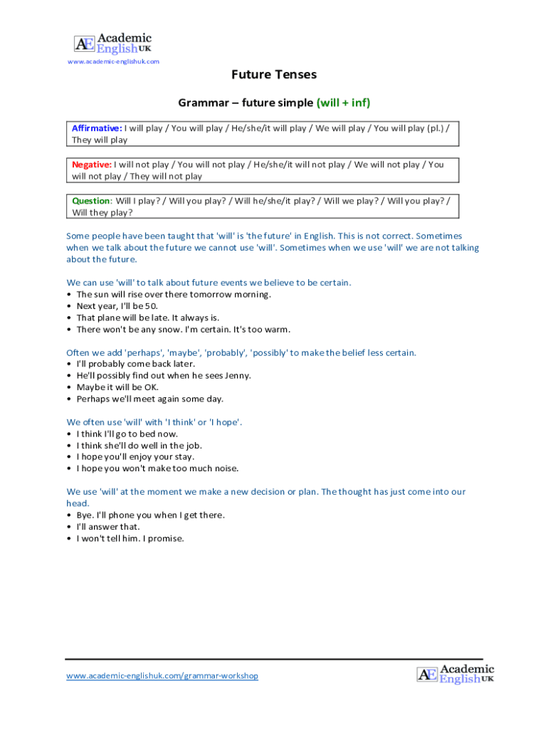 WWW.academicenglishuk.couture Tenses Grammar future simple (will + inf)Affirmative: I will play / You will play / He/she/it will play / We will play / You will play (pl.) / They will play Negative: