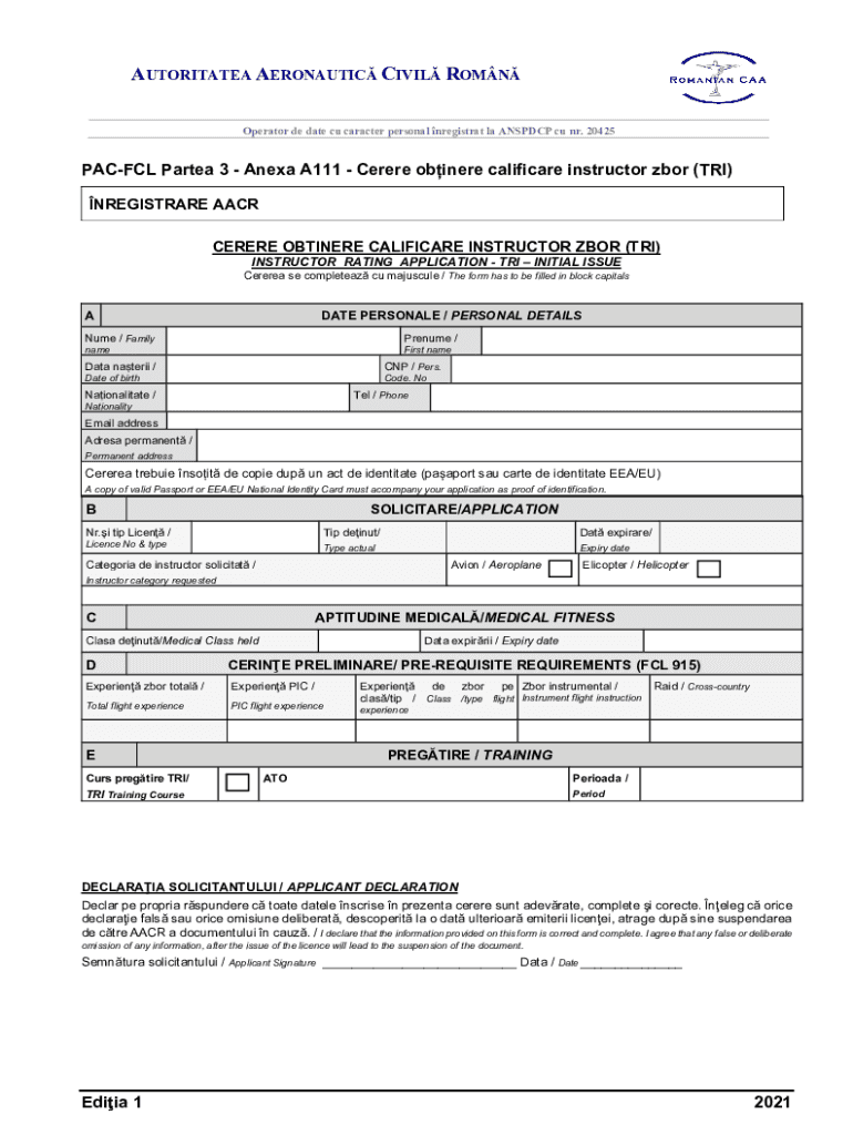 Get the free PAC-FCL Partea 3 - Anexa A111 - Cerere obinere calificare instructor zbor (TRI)