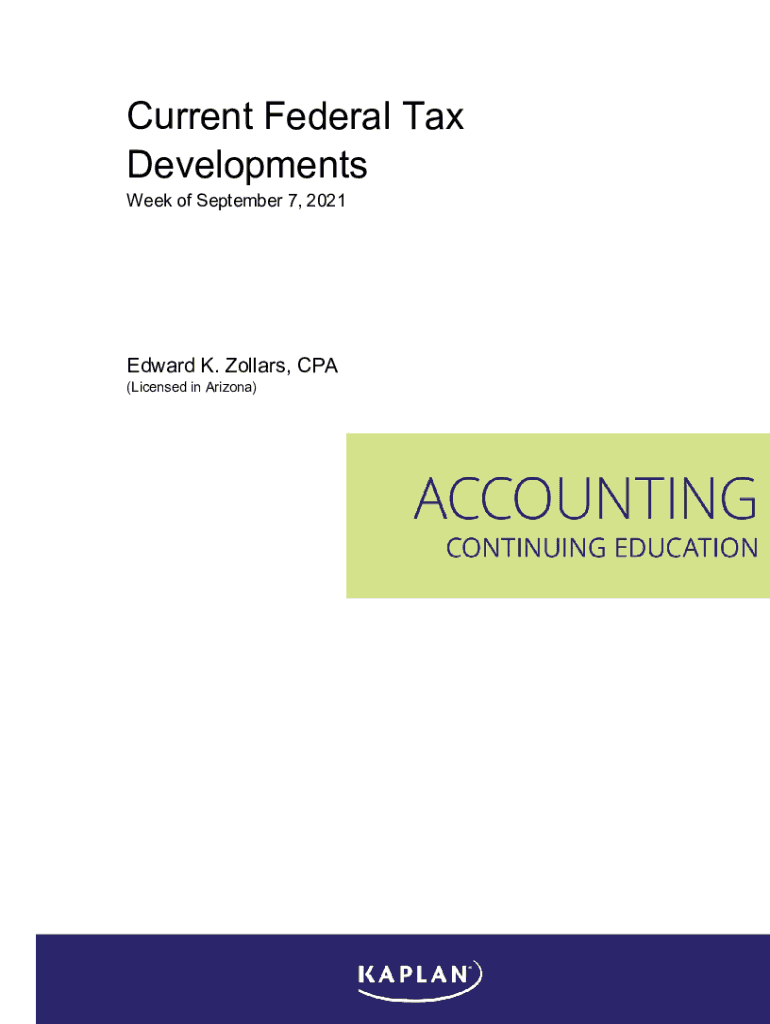 August 30Current Federal Tax Developments Week of September 7, 2021Edward K. Dollars, CPA (Licensed in Arizona)CURRENT FEDERAL TAX DEVELOPMENTS WEEK OF SEPTEMBER 7, 2021 2021 Kaplan, Inc. Published