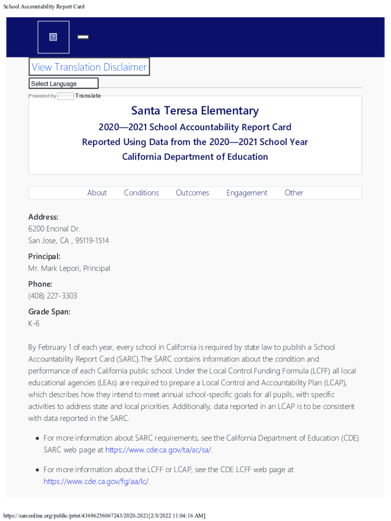 School Accountability Report Cardie TRANSLATION DISCLAIMER View Translation Disclaimer Select Language Powered byTranslateSanta Teresa Elementary20202021 School Accountability Report CardReported