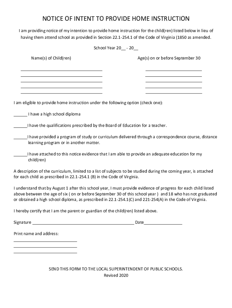 NOTICE OF INTENT TO PROVIDE HOME INSTRUCTION I am providing notice of my intention to provide home instruction for the child(men) listed below in lieu of having them attend school as provided in Section