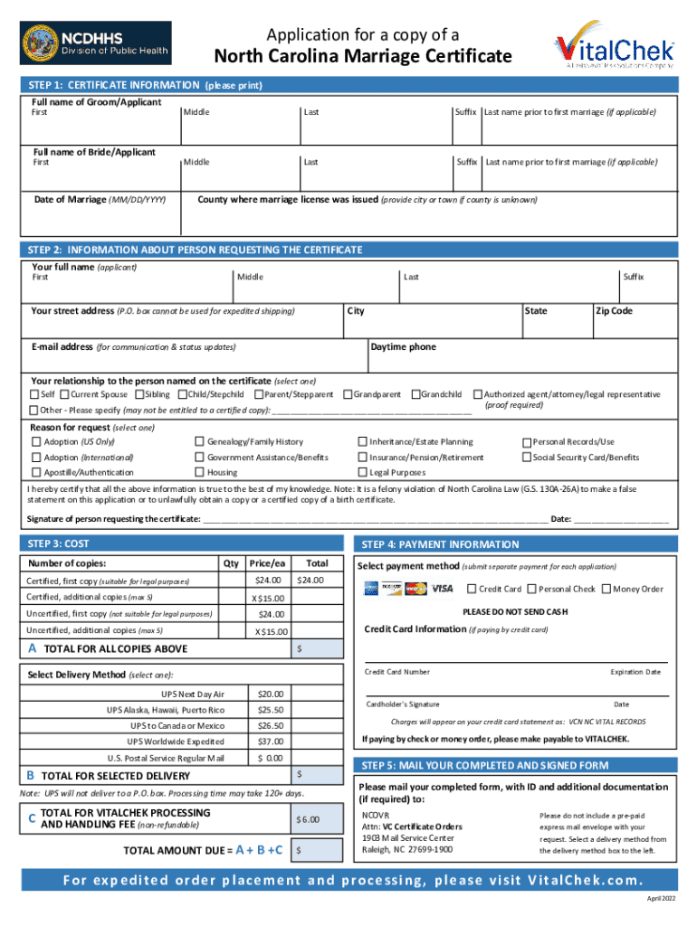 Application for a copy of North Carolina Marriage Certificate 1. A certificate search costs $24 and includes one copy if the certificate is located. The search covers a threader period. Requests are