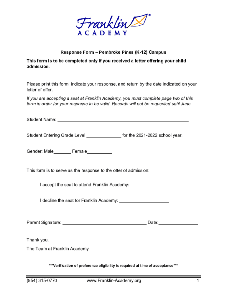 Response Form Pembroke Pines (K12) Campus This form is to be completed only if you received a letter offering your child admission. Please print this form, indicate your response, and return by the