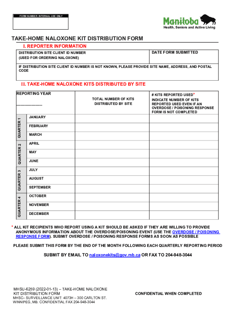 FORM NUMBER: INTERNAL USE Telehealth, Seniors and Active LivingTAKEHOME NALOXONE KIT DISTRIBUTION FORM I. REPORTER INFORMATIONAL FORM SUBMITTEDDISTRIBUTION SITE CLIENT ID NUMBER (USED FOR ORDERING