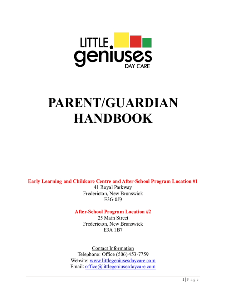 PARENT/GUARDIAN HANDBOOKEarly Learning and Childcare Center and Interschool Program Location #1 41 Royal Parkway Fredericton, New Brunswick E3G 0J9 Interschool Program Location #2 25 Main Street Fredericton,
