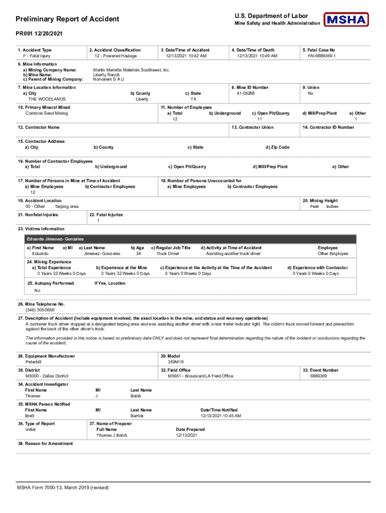 U.S. Department of LaborPreliminary Report of AccidentMine Safety and Health AdministrationPR001 12/20/2021 1. Accident Type F Fatal Injury3. Date/Time of Accident 12/13/2021 10:42 AM2. Accident Classification