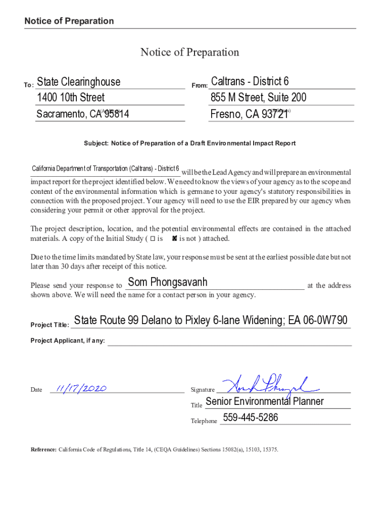 Get the free Notice of Preparation Fresno, CA 93721 Som Phongsavanh State ...