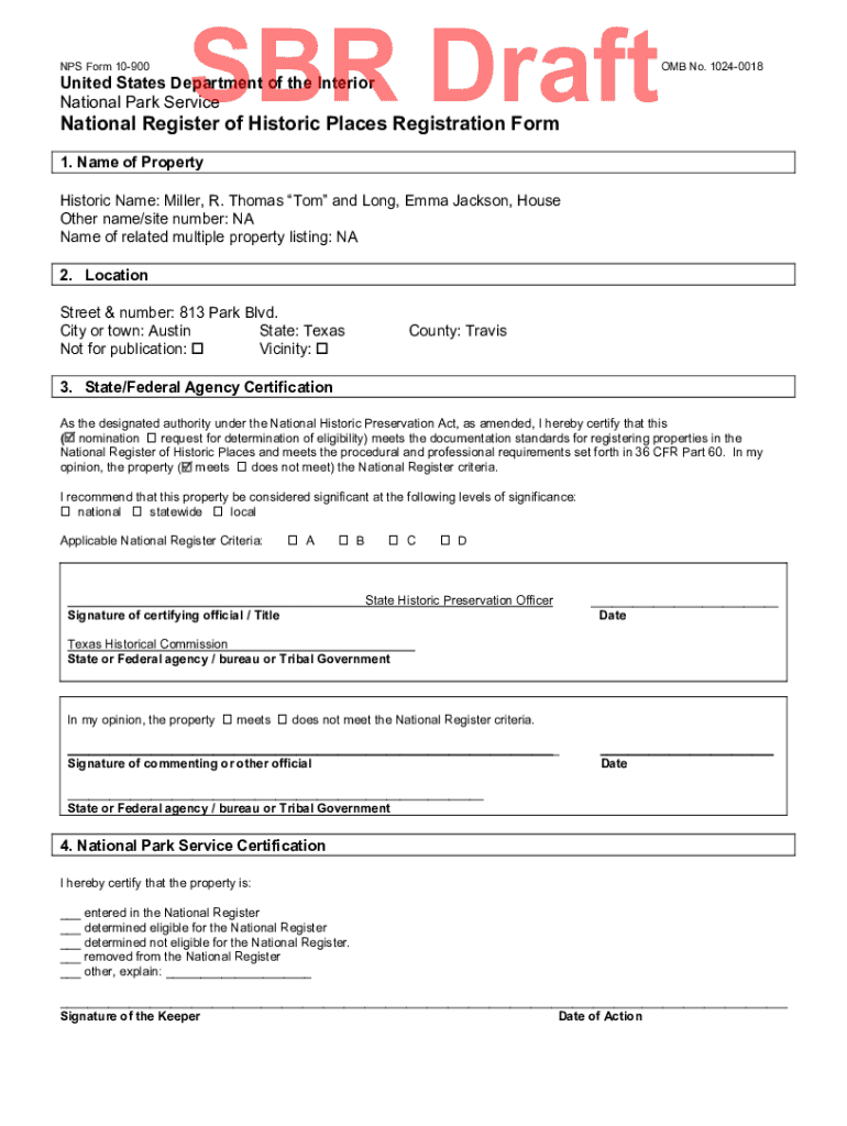 NPS Form 10900SBR DraftUnited States Department of the Interior National Park Service OMB No. 10240018National Register of Historic Places Registration Form 1. Name of PropertyHistoric Name: Miller,