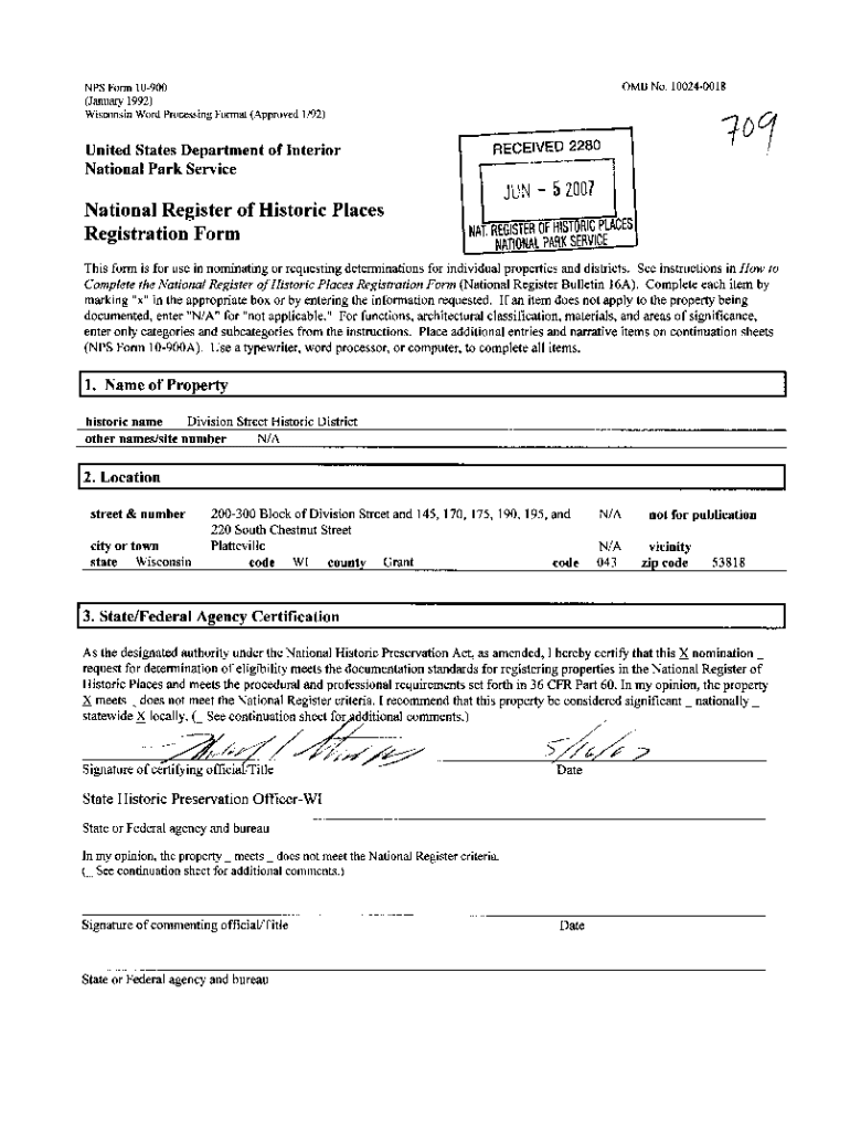 OMB No. 100240018NFS Form 10900 (January 1992) Wisconsin Word Processing Format (Approved 1/92)United States Department of Interior National Park ServiceRECEIVED 2280JUN 5 Zoos? National Register