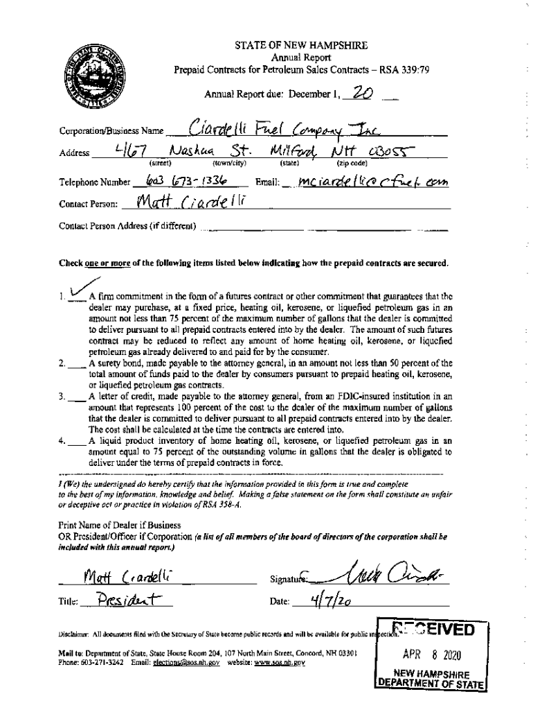Get the free New Hampshire Annual Report - Prepaid Contracts for Petroleum Sales ... - sos nh