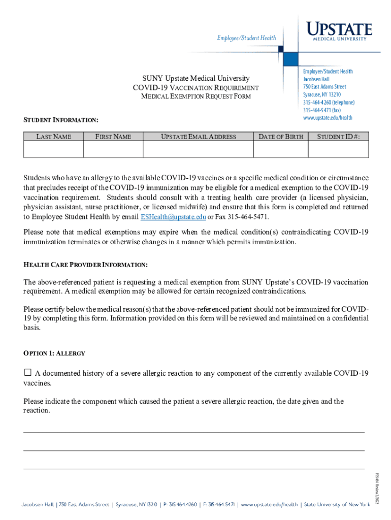 Employee/Student HealthEmployee/Student Healthy Upstate Medical University COVID-19 VACCINATION REQUIREMENT MEDICAL EXEMPTION REQUEST FORMSTUDENT INFORMATION: LAST NAMEFIRST NAMEPLATE EMAIL ADDRESSEmployee/Student