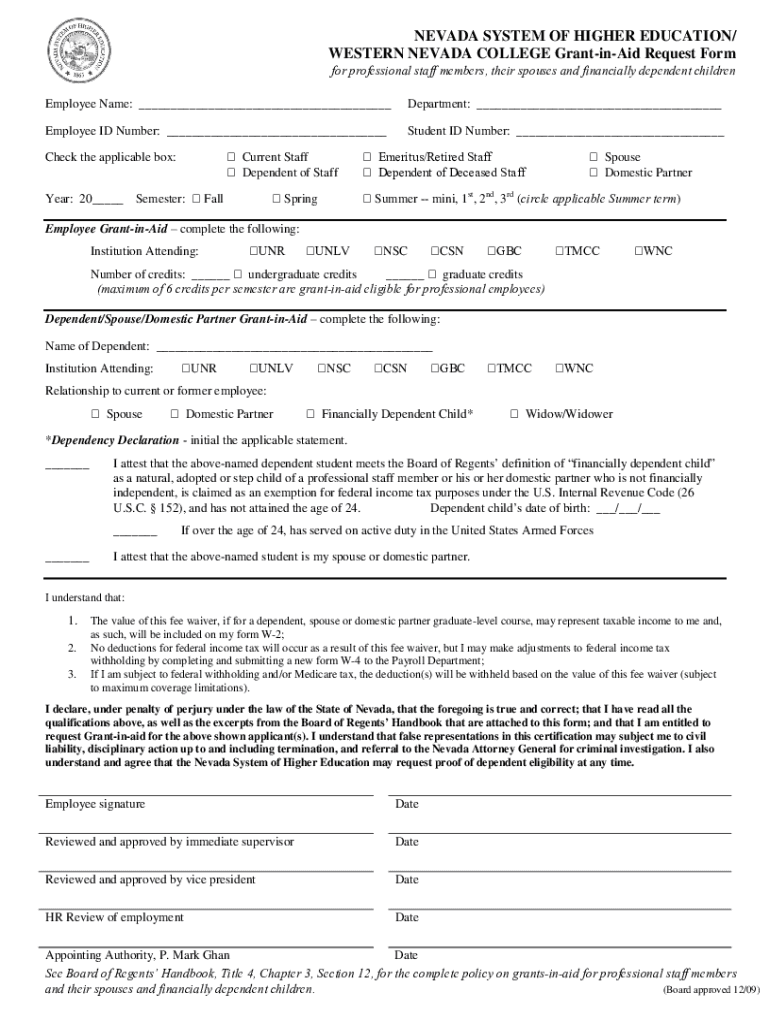 NEVADA SYSTEM OF HIGHER EDUCATION/ WESTERN NEVADA COLLEGE Granting Request Form for professional staff members, their spouses and financially dependent childrenEmployee Name: ___Department: ___Employee