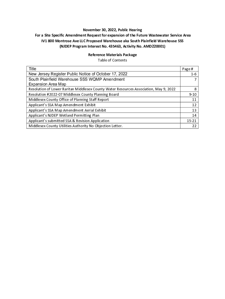 November 30, 2023, Public Hearing For a Site Specific Amendment Request for expansion of the Future Wastewater Service Area IV1 800 Montrose Ave LLC Proposed Warehouse aka South Plainfield Warehouse