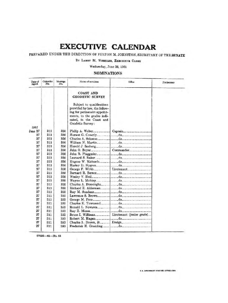 EXECUTIVE CALENDAR PREPARED UNDER THE DIRECTION OF ELTON M. JOHNSTON, SECRETARY OF THREAT BY LARRY.WHEELER, EXECUTIVE CLERK Wednesday, June 28, 1961NOMINATIONS Date of reportCalepdar No. Message No.