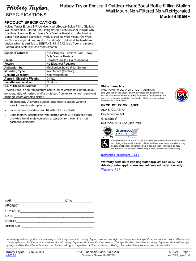 SPECIFICATIONS Halsey Taylor Endure II Outdoor Hydrologist Bottle Filling Station Wall Mount Unfiltered Unrefrigerated Model 4405BFPRODUCT SPECIFICATIONS Halsey Taylor Endure II Outdoor Hydrologist