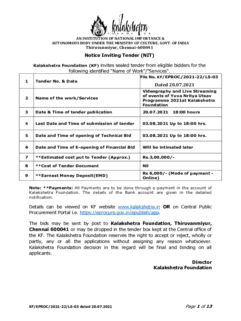 AN INSTITUTION OF NATIONAL IMPORTANCE & AUTONOMOUS BODY UNDER THE MINISTRY OF CULTURE, GOVT. OF INDIAThiruvanmiyur, Chennai600041Notice Inviting Tender (NIT) invites sealed tender from eligible bidders