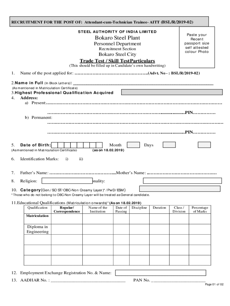 RECRUITMENT FOR THE POST OF: AttendantcumTechnician Trainee PITT (BSL/R/201902) STEEL AUTHORITY OF INDIA LIMITEDBokaro Steel Plant Personnel Department Recruitment SectionBokaro Steel City Trade Test