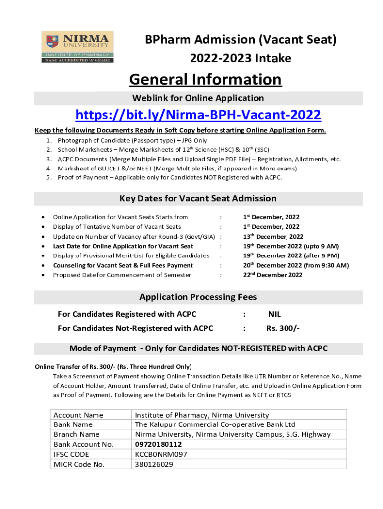 BP harm Admission (Vacant Seat) 20222023 IntakeGeneral Information Weblink for Online Applicationhttps://bit.ly/NirmaBPHVacant2022 Keep the following Documents Ready in Soft Copy before starting Online