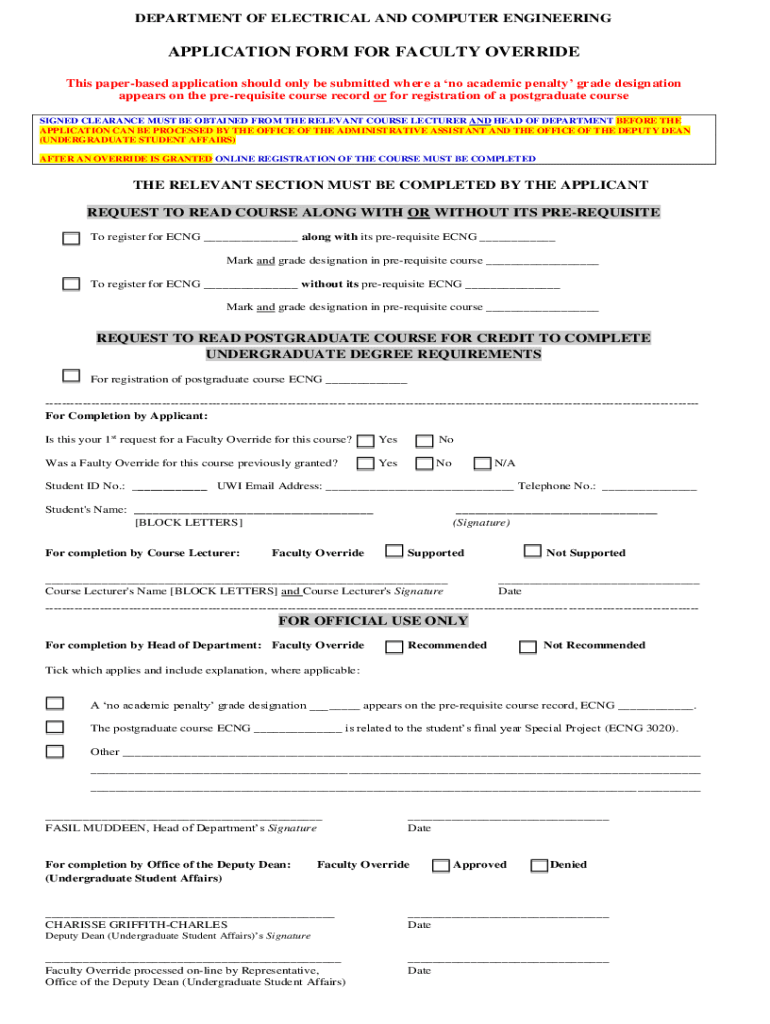 DEPARTMENT OF ELECTRICAL AND COMPUTER ENGINEERINGAPPLICATION FORM FOR FACULTY OVERRIDE This paper based application should only be submitted where a no academic penalty grade designation appears on