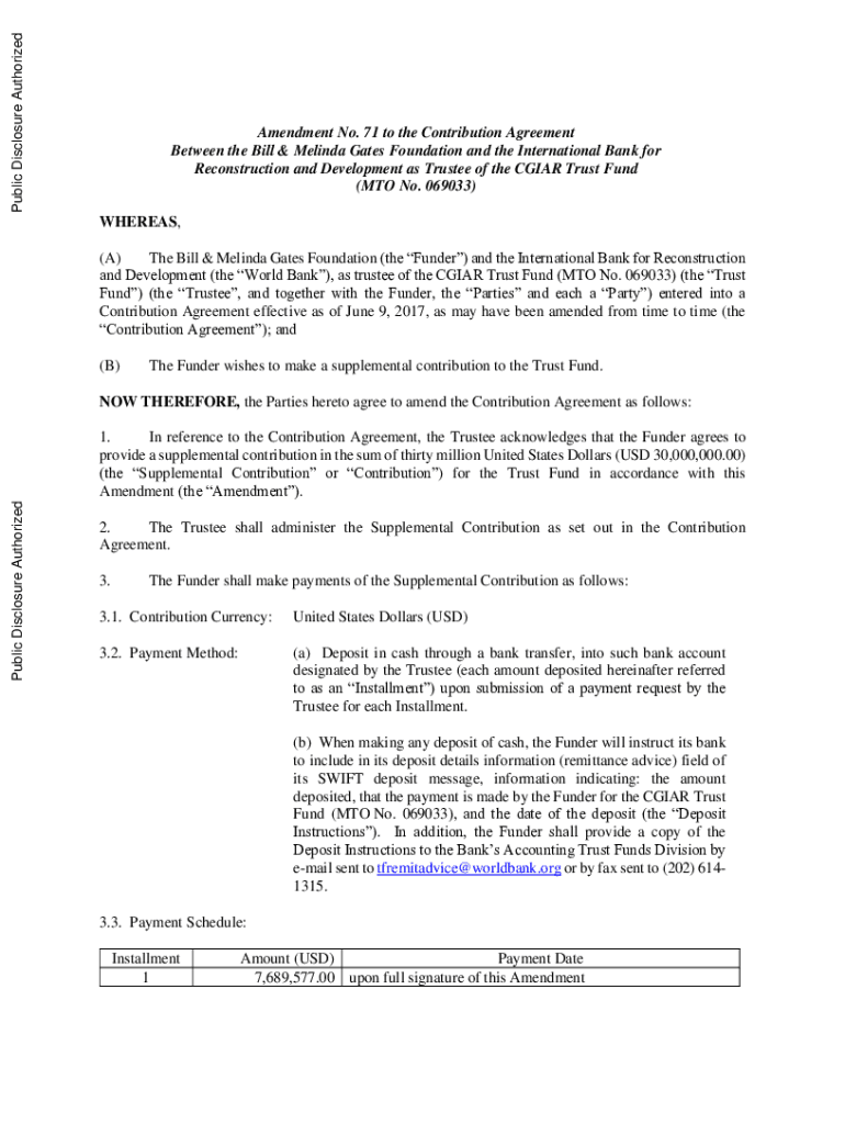 Public Disclosure AuthorizedAmendment No. 71 to the Contribution Agreement Between the Bill & Melinda Gates Foundation and the International Bank for Reconstruction and Development as Trustee of the