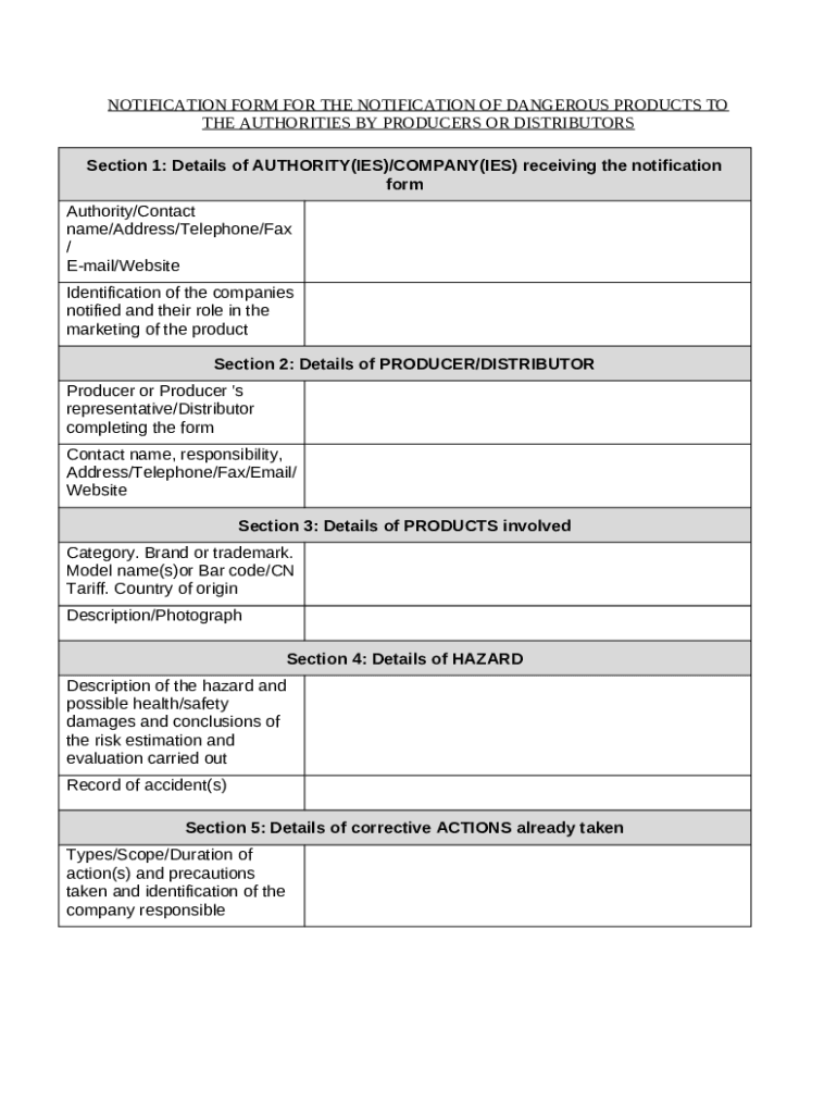 NOTIFICATION FOR THE NOTIFICATION OF DANGEROUS PRODUCTS TO THE AUTHORITIES BY PRODUCERS OR DISTRIBUTORS template instructions