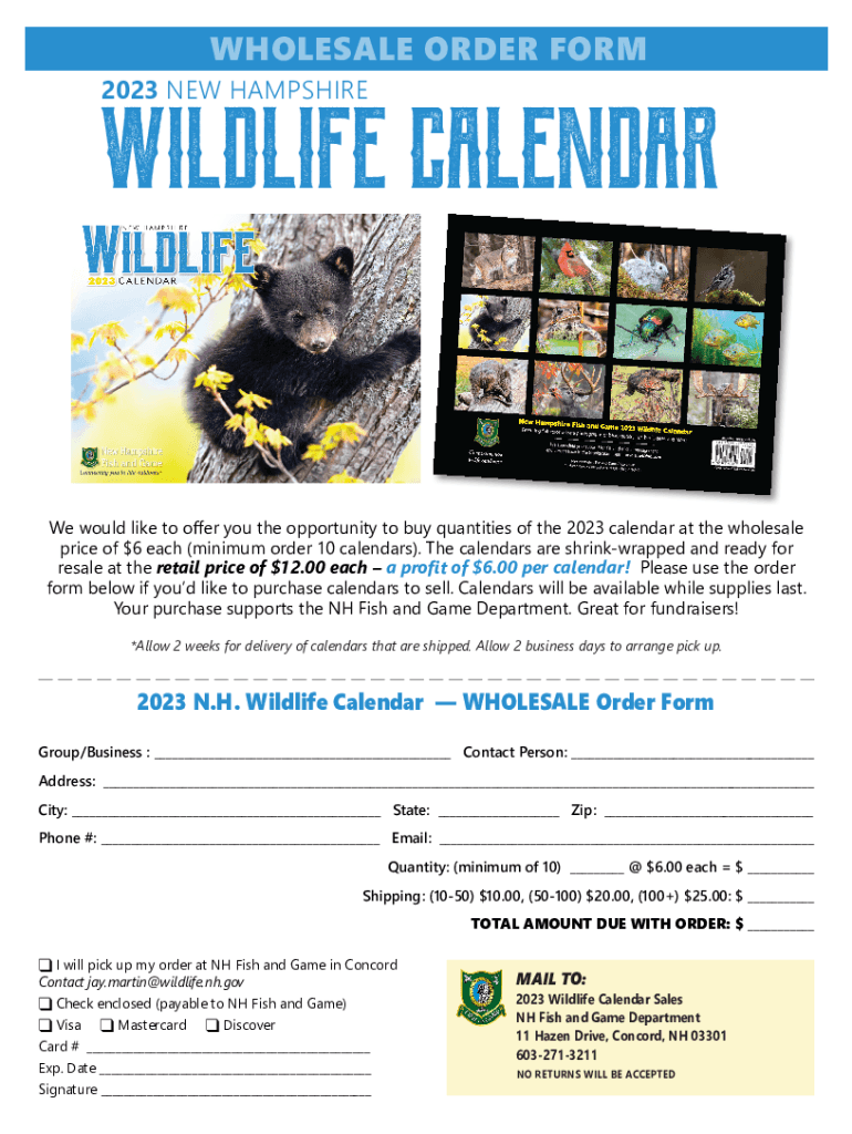 WHOLESALE ORDER FORM2023 NEW HAMPSHIREWILDLIFE Calendar would like to offer you the opportunity to buy quantities of the 2023 calendar at the wholesale price of $6 each (minimum order 10 calendars).