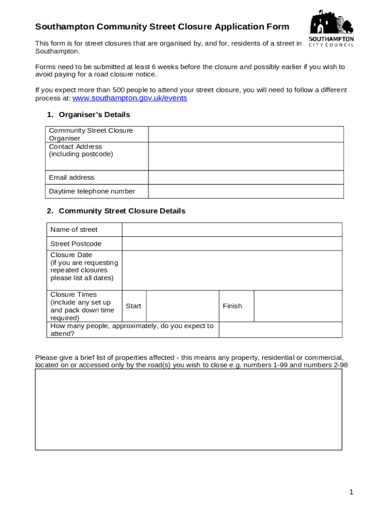 Instructions for the form Southampton Community Street Closure Application
